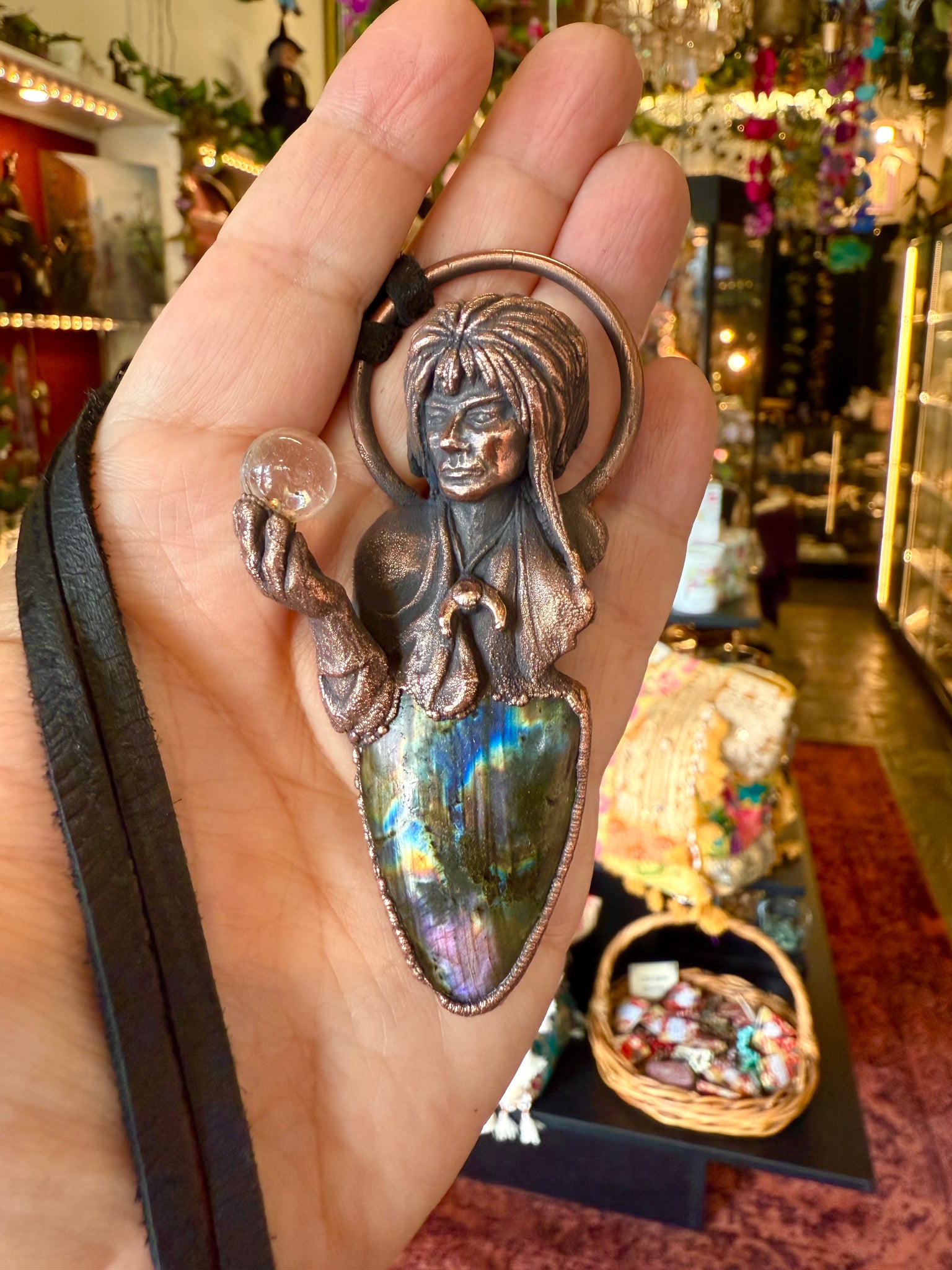 Features a Labradorite crystal (the stone of magic and manifestation) and a clear Quartz crystal ball!